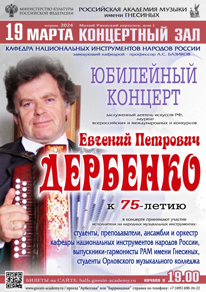 Приглашаем всех любителей гармони на юбилейный авторский вечер композитора Евгения Петровича Дербенко, который состоится в концертном зале Российской академии музыки имени Гнесиных 19 марта в 19:00. Это будет поистине праздник русской гармонии!
